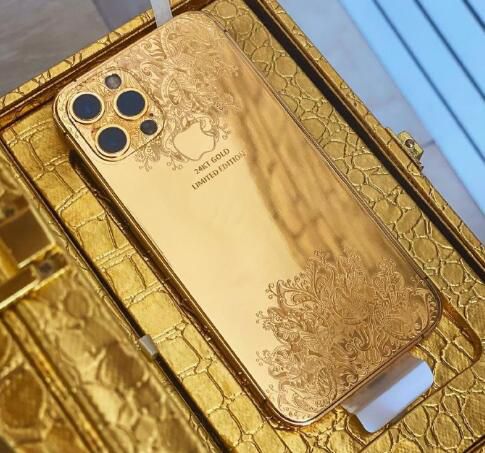 iPhone 12 Pro黄金版是依旧是24K纯金,由750块金块打造,背面的雕花也很精致,在黄金背板之上还镶嵌有8颗纯天然钻石,可以说是金光闪闪。