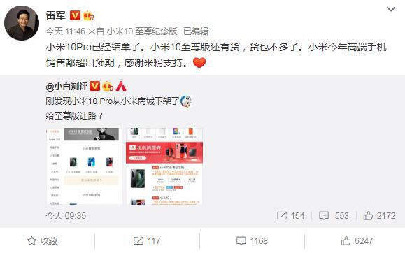 11月4日上午,雷军激动发文,表示小米今年高端手机销售都超出预期,其中小米10Pro已经结单了,小米10至尊版还有货,货也不多了,并感谢米粉的支持。