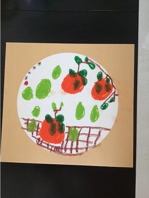 我记得那一节课的课题是画柿子~老师一进教室引导孩子去想冬天有什么水果,孩子说了一些后,老师就问有没有吃过柿子哦~就听到孩子分享说:“我们幼儿园的院子里就有好几颗柿子树呢~”。老师就引导孩子去回忆柿子树有什么特点,说要选几颗自己最喜欢的柿子画出来~于是就有了这次的柿子树上的各种果实。